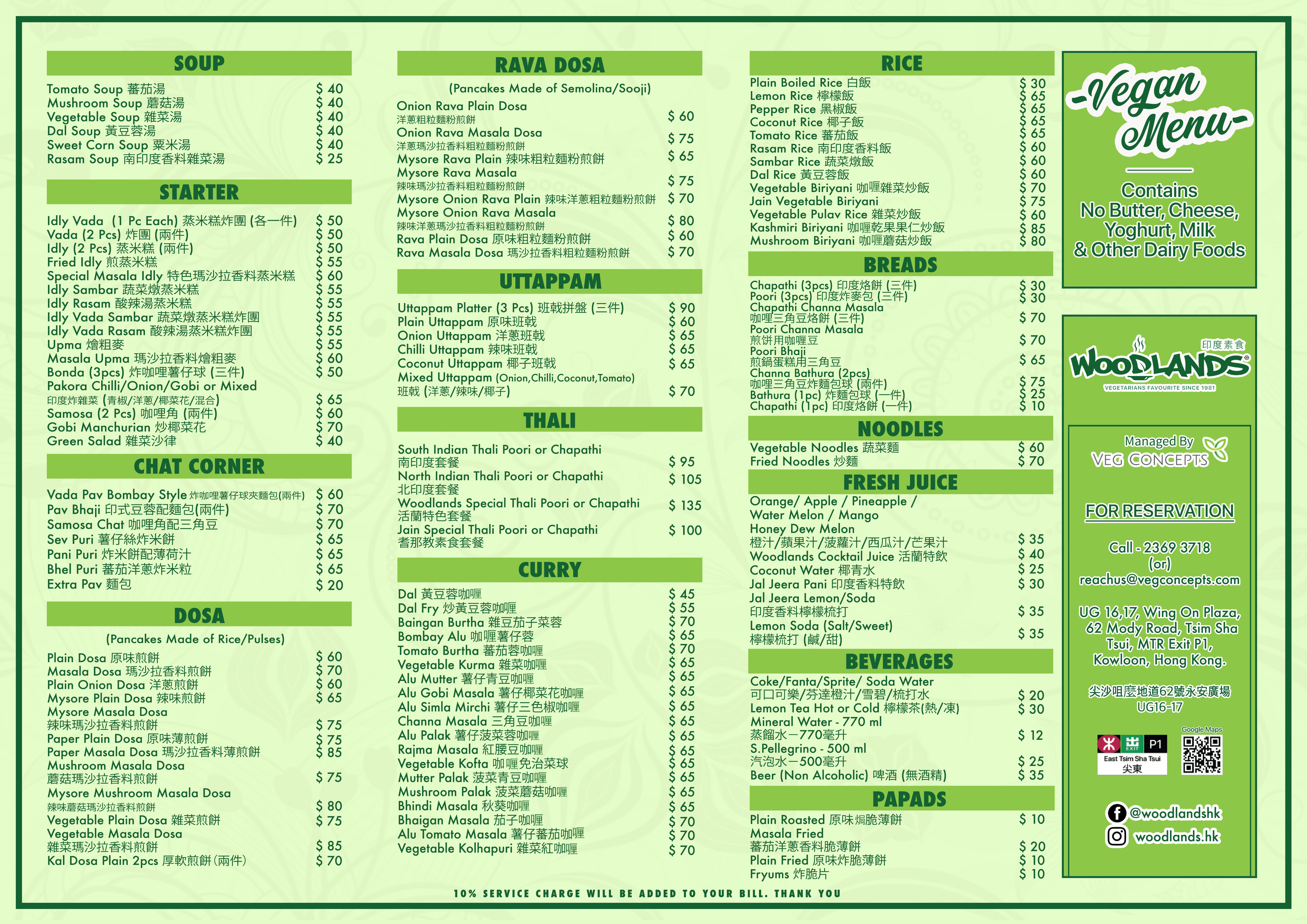Vegan Menu Woodlands Vegetarian Restaurant Tsim Sha Tsui - Green Queen